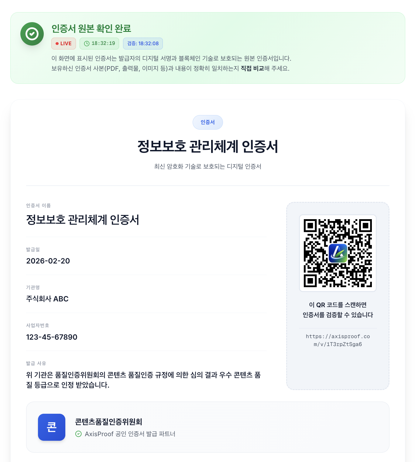 AxisProof는 블록체인 기반 인증서 발급 및 검증 플랫폼입니다. 수료증, 자격증, 인증서 등을 디지털로 발급하고, 해시값을 블록체인(Polygon)에 기록하여 위변조를 원천 차단합니다. 발급된 인증서는 QR 코드 스캔으로 즉시 진위 여부를 확인할 수 있습니다.