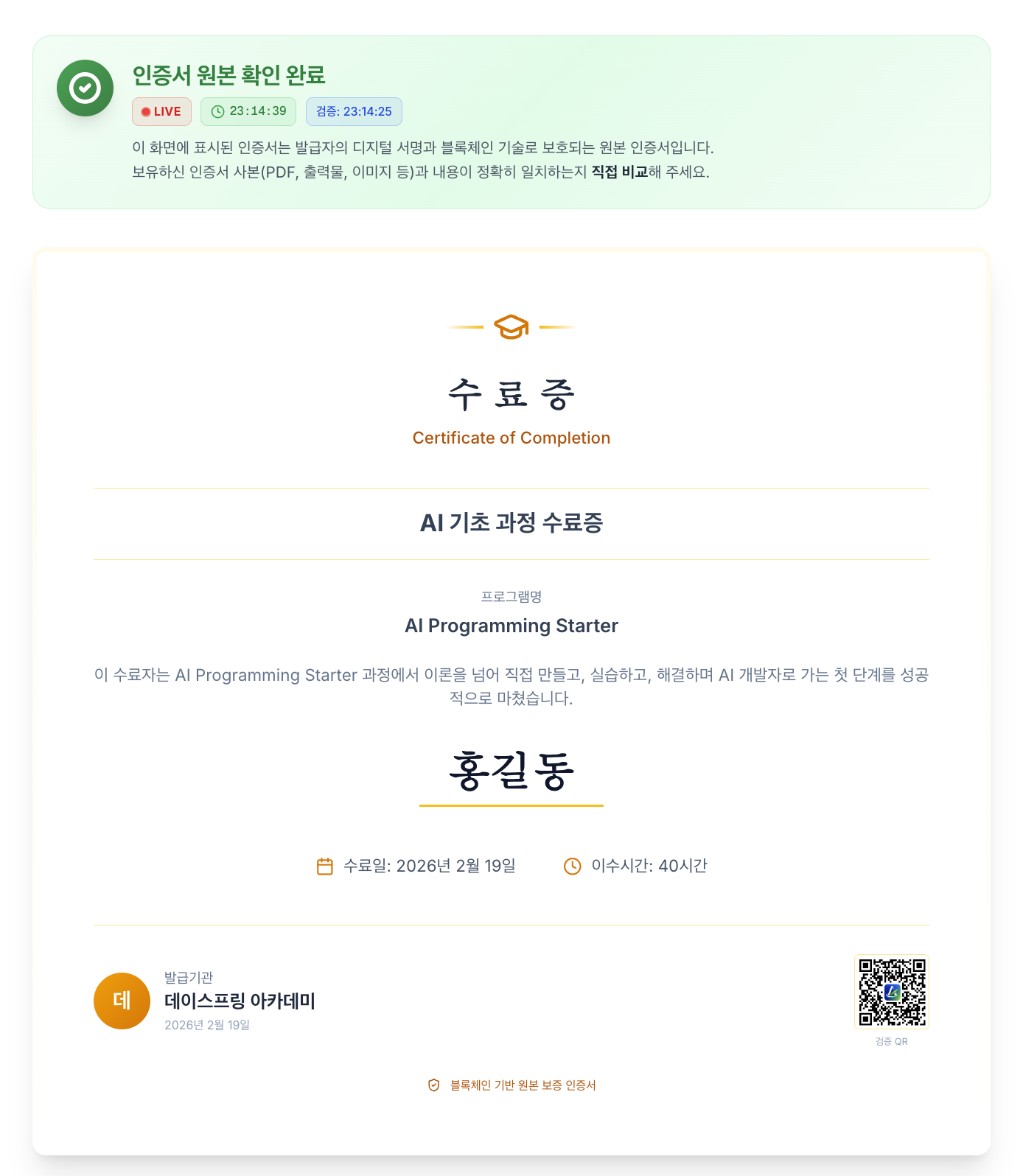 수료증, 이수증, 졸업증명서를 디지털로 발급하고 즉시 검증 가능하게 만드세요.