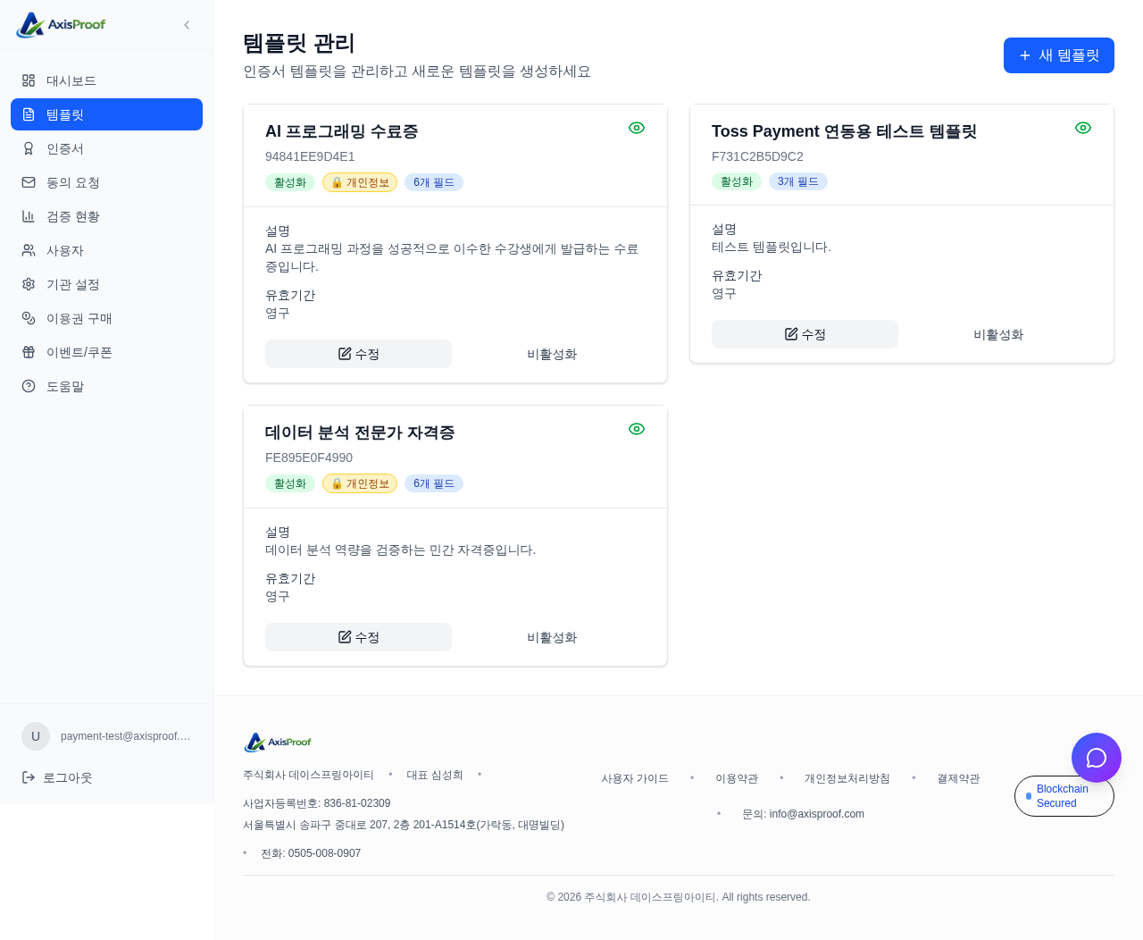 AxisProof 콘솔에서 인증서 템플릿을 만드는 방법을 단계별로 안내합니다. 수료증 디자인부터 필드 설정, 만료 정책까지 템플릿 만들기의 모든 것.