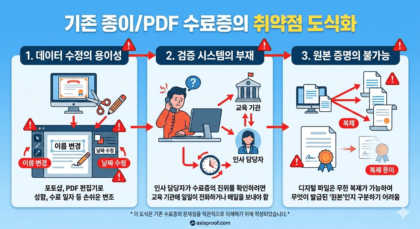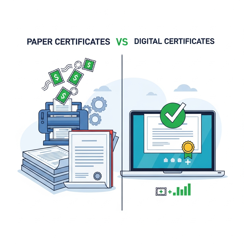 종이 수료증에서 디지털 수료증으로 전환을 고민 중이신가요? 비용 절감, 위변조 방지, 즉시 검증까지 — 교육기관이 디지털 수료증을 도입해야 하는 5가지 핵심 이유를 정리했습니다.